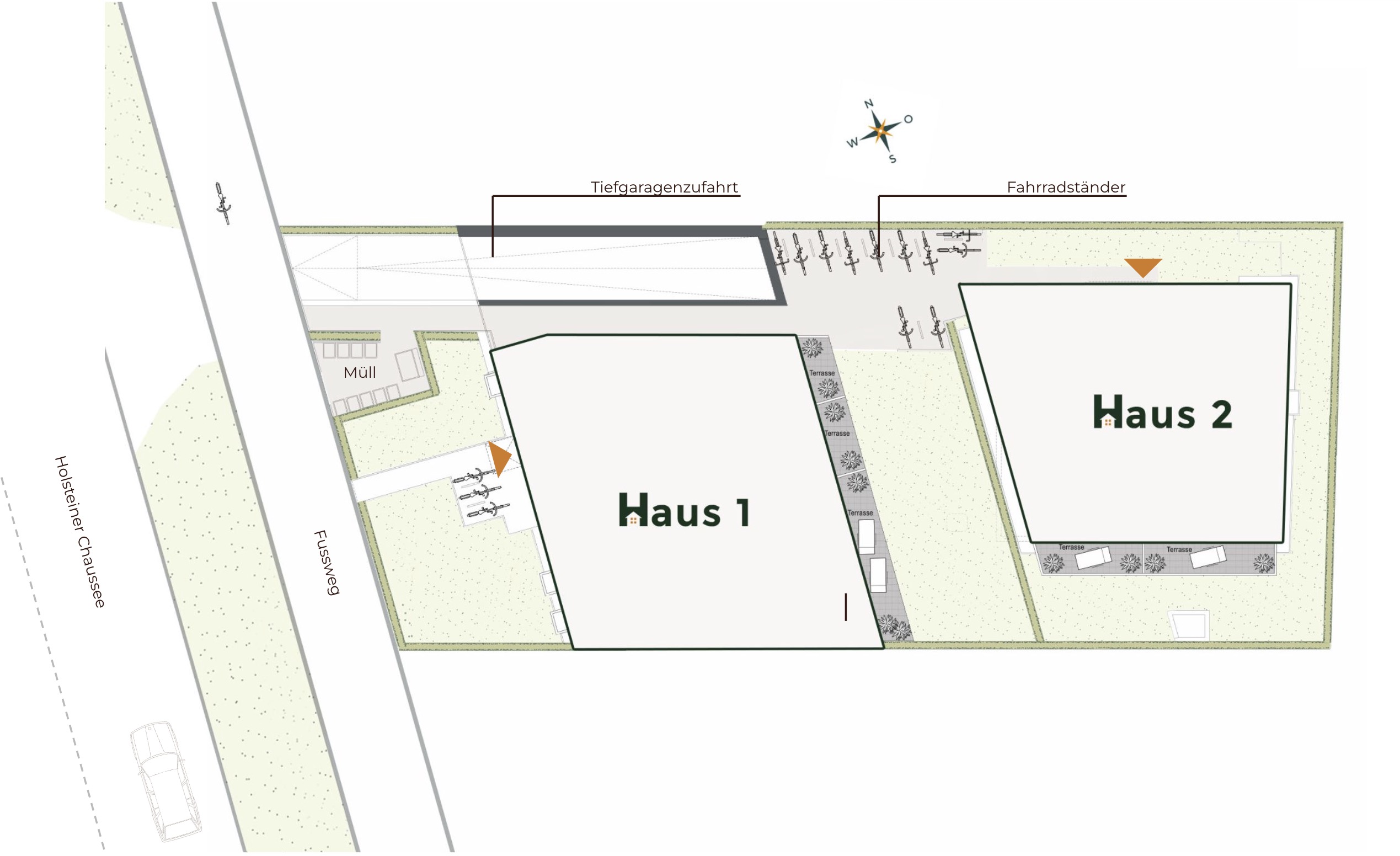 Auf dem Gelände entstehen zwei moderne Häuser, die optimal in die Umgebung eingebettet sind. Wer mit dem Auto anreist, kann direkt von der Holsteiner Chaussee in die Tiefgarage einfahren und von dort bequem und trockenen Fußes in beide Gebäude gelangen. Auch Fahrradfahrer kommen auf ihre Kosten: Über den entspannten Weg in den Hinterhof finden Sie einen sicheren Abstellplatz für ihren treuen Drahtesel.